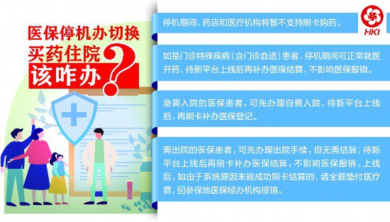 那么,这几天,住院、就医、购药等要如何结算操作呢?何女士收到的短信内容给出了部分答案——“为保障您的就医用药需求,特提示如下:1.停机期间,药店和医疗机构将暂不支持刷卡购药,如有用药需求,可在停机之前提前刷卡购药。2.城乡居民参保人员和高血压、糖尿病门诊的医保患者,有用药需求,请在停机前开具停机期间所需药品。3.如您是门诊特殊疾病(含门诊血透)患者,停机期间您可正常就医开药,待新平台上线后再补办医保结算,不影响医保报销。”