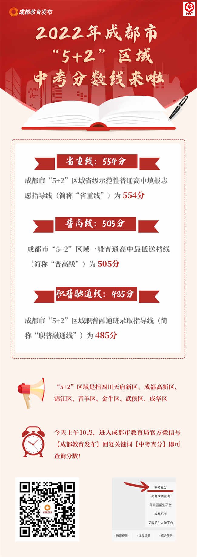 人民网成都6月28日电 (王波)6月28日,成都市教育局公布2022年中考分数线,省重线:554分;普高线:505分;职普融通线:485分。