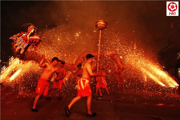 锣鼓声响金龙出。由擎珠人打头阵,高举龙珠逗引,舞龙人奋力挥舞,金龙蜿蜒翻腾,时而昂首爬升,时而俯冲盘旋。周围的人看准时机,朝着飞龙点燃竹筒“花子”,漫天火光中游龙戏珠的模样令人久久难忘。