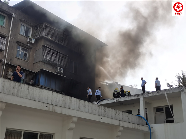 “不好,邻居出现了火灾,大家快去救火”。第一个发现火情的安全保卫部负责人一边向大家呼喊并拨打119和110,一边拿起灭火器跑向食堂楼顶,总行领导立即现场展开应急指挥,机关其他部室干部员工闻令而动,灵活运用平时防火演练所学技能,有序地开展现场救援。由于与发生火灾单位的宿舍楼相邻,为控制火势上涨,避免波及相邻建筑,造成更大损失,我行干部员工不畏危险,面对浓烟,头顶烈火,手握灭火器爬上距离火源最近的食堂房顶,在房顶上遏制火势。当时天气非常炎热,火光和阳光两面挟击,部分同事手都烫脱了皮,汗水湿透衣服,不忘对住宿楼和周边建筑物的居民喊话:“快出来!不要聚集,不要呆在家,不要拿东西,危险!”食堂楼下机关干部员工帮忙递水和灭火器具,互相配合默契,齐心协力灭火,坚持到县消防大队赶来支援灭火战斗。经过90分钟努力火势终被扑灭,由于发现早、救援及时,未造成人员伤亡,大家长舒了一口气。